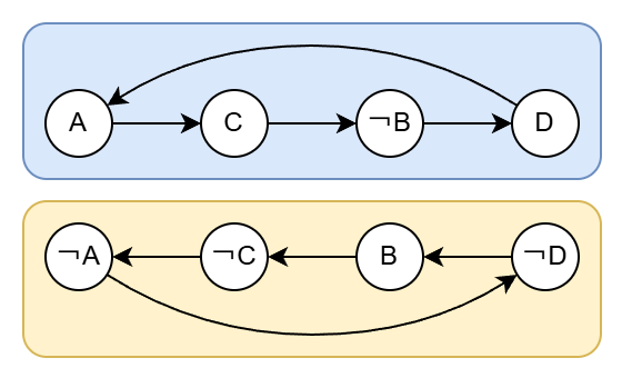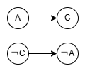첫 번째 절을 보면 ¬A∨C = True여야 합니다. 그렇다면 A = True일 때 C가 반드시 True여야 하고(A→C), C = False일 때, A가 반드시 False여야 합니다.(¬C→¬A) (반대는 성립하지 않는 경우가 있습니다.) 각 논리 상태를 정점으로 두고 연결하면 다음과 같이 표현할 수 있습니다.