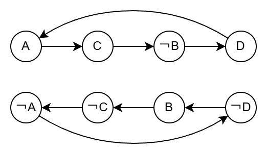 모든 절에서 이렇게 두 가지 간선이 나옵니다. 이제 A~D의 모든 논리 상태를 논리식에 따라 표현해보겠습니다.