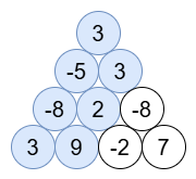 예제 입력 1의 결과는 위 그림과 같습니다. 파란 공들을 쭉 선택하면 총 합이 7점으로 최대입니다. 가장 큰 점수인 9점을 고르려면 그 위에 있는 -8점과 2점을 골라야 합니다. 2점을 고르려면 그 위에 -5점과 3점을 골라야 합니다. 그러려면 맨 위의 3점도 골라야합니다. 그러고 나면 -8점 아래의 3점은 그냥 고를 수 있습니다. 오른쪽 맨 밑의 7점을 먹으려면 그 위에 있는 -8점을 골라야하는데 그러면 합이 -1로 손해이기 때문에 고르지 않습니다. 필요한 아이디어를 찾기 위해 그림을 좀 크게 그려서 살펴봤습니다.