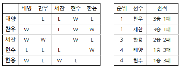 고려대학교 중앙 배드민턴 동아리 KUBC에서 정회원들을 대상으로 리그를 했다. 태양이를 포함해서 N명의 정회원들이 리그에 참여했고, 총 N(N-1)/2번의 경기를 진행하였다. 그 결과 모든 경기가 승부가 나서 N명의 선수들의 순위표가 만들어졌다.