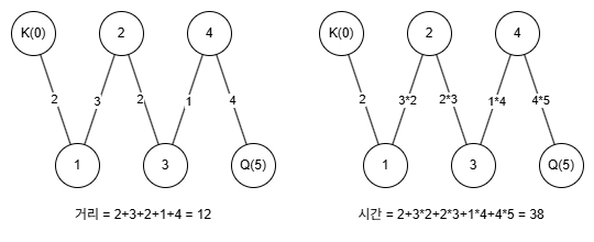 K에서 3으로 직행하는 거리는 3이라고 쳐봅시다. 그럼 이건 그대로 거리 정보를 가져올 수 있습니다. 왜냐면 처음엔 왕의 이동 속도가 1칸에 1시간이기 때문입니다. 그런데 이전에 탐색했던 정보를 그대로 가져오면 3번 나무를 지나 4번 나무를 갈 때 왕이 선물을 이미 3개나 들고 있는 상태의 정보가 넘어옵니다. Q에게 갈 때는 선물이 4개입니다. 실제로 탐색한 전체 선물은 2개인데 말입니다. 따라서 이렇게 실제 K에서 Q까지의 탐색 중 하위 탐색들의 소모 시간을 그대로 저장했다간 선물 갯수가 맞지 않아 잘못된 정보를 가져오게 됩니다. 이걸 해결할 방법으로 두 가지를 떠올렸습니다.