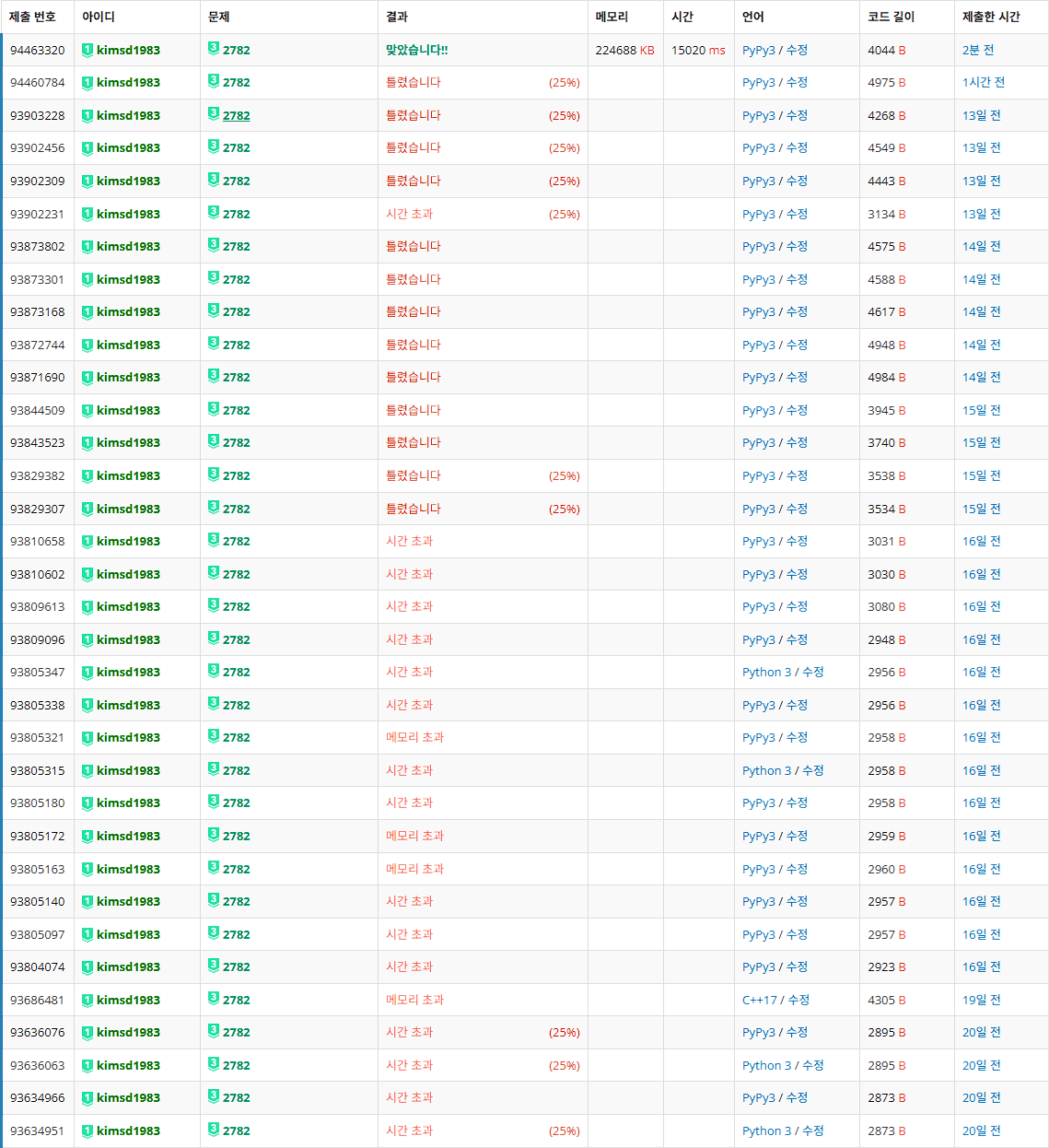 뭐가 문제였냐면, 도달할 수 없는 선물 나무의 정보가 그래프와 dp 테이블에 남아있었던 거예요. 그래서 초기 그래프 구성 단계에서 왕이 갈 수 없는 선물 나무는 아예 정점으로 관리하지 않기로 했습니다. 그렇게 개선했는데도 채점 결과는 25%를 못넘겼습니다.