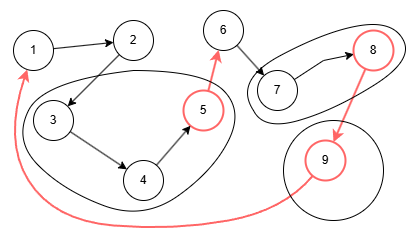 진입차수가 0인 곳에서 시작된 그래프가 사이클이 만들어진 곳에서 무한히 순환하게 됨을 알 수 있습니다. 이 부분을 탐색이 끝나는 지점이라고 생각해봅시다. 사이클의 끝이 탐색했던 곳으로 재진입하는 정점(위 그래프에서는 5, 8, 9)이라고 해보겠습니다.