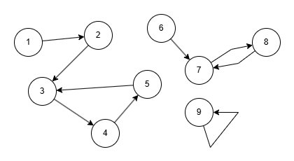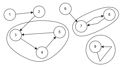이제 진입차수가 0인 곳으로부터의 탐색은 끝났습니다. 하지만 아직 남아있는 부분이 있습니다. 아까 그래프의 9번 정점 같은 부분은 스스로가 진입 간선을 만들고 있습니다. 애초에 조건에 맞지 않는 정점이긴 하지만 이 정점이 만약 여러 개의 정점으로 이루어진 하나의 SCC라면 이렇게 됩니다.
