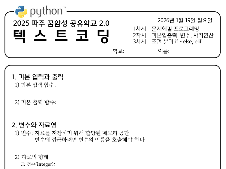 수업 자료도 간단하게 제작했다. 수업 내용을 직접 정리할 수 있도록 구성했는데 이 부분은 실수였다. 학생들은 학습 내용을 메모하면서 처음 듣는 내용을 머리에 기억해야 하고 코딩까지 해야 한다. 할 일이 너무 많았지 않았을까 싶어 수업 중반부터는 모든 자료에 빈칸을 두지 않았다. 하지만 학생들은 학습지를 챙겨가지 않았다. 이 부분은 수업 자체에 열의가 없었던 것도 있겠지만 배부 방식에 문제가 있던 것도 있다. 이렇게 매일 한 장 한 장을 나눠줄 것이 아니라 모든 차시의 자료가 하나의 교재로 엮어진 채로 나갔어야 했다. 그러나 수업을 준비할 시간이 충분하지 않았기에 어쩔 수 없이 매 회차 그 날의 학습 내용을 나눠줄 수밖에 없었다.