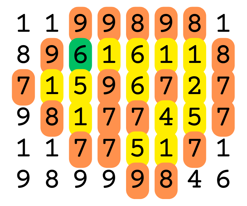 초록색 위치에서 탐색을 시작하면 노란색 영역이 주황색으로 둘러싸이게 됩니다. 주황색 중 가장 높이가 낮은 곳은 7입니다. 이번에 탐색한 영역은 최소한 높이 7까지 물을 채울 수 있습니다. 물 높이를 관리할 2차원 배열에 탐색 결과로 높일 수 있는 물 높이를 관리해줍니다.