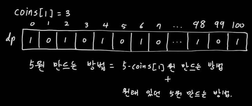 이렇게 i번째 동전의 액면가를 coins[i], k원을 만드는 방법의 수를 dp[k]라고 하면 dp[k] = dp[k - coin[i]] + dp[k] 라고 할 수 있다.