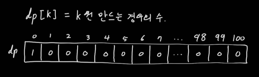 dp[k]는 k원을 만드는 경우의 수를 저장할 배열이다. 이 배열이 2차원이어야 할 것 같은데 의외로 1차원으로 충분하다. 이유는 각 금액별 경우의 수가 연쇄적으로 이전 값을 불러오기 때문이다. dp[0]은 0원을 만드는 경우의 수다. 아무 동전을 사용하지 않는 1가지 경우가 있으므로 1, 나머지는 모두 0으로 초기화한다.