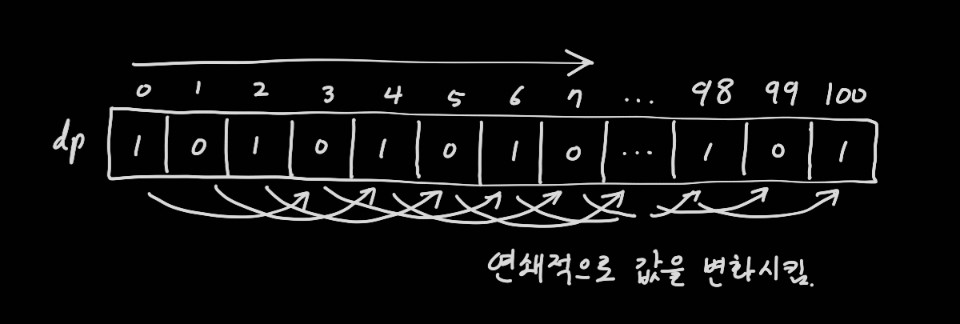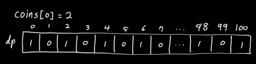 첫번째 동전인 2원으로 경우의 수를 따져본다. 0원을 만드는 경우는 2원을 사용하지 않는 것으로, 이전 값을 그대로 두면 된다. 2원을 만드는 경우는 원래 0이었으나, 0원을 만드는 경우에서 2원 하나를 사용하면 되기 때문에 dp[2] + dp[2 - 2]로 1가지이다. 4원을 만드는 경우는 기존의 4원을 만드는 방법을 그대로 두고, 추가로 2원을 만드는 경우에서 2원을 하나 더 사용하면 된다. dp[4] + dp[4 - 2] = 1. 이런 과정으로 dp[100]까지 채울 수 있다.