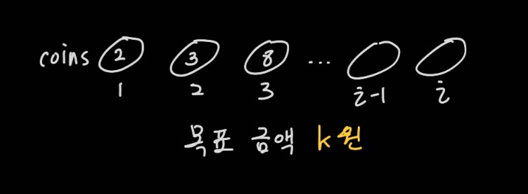 동전들이 2, 3, 8, ...로 주어지는 상황을 가정해보자. k원은 100원으로 설정.