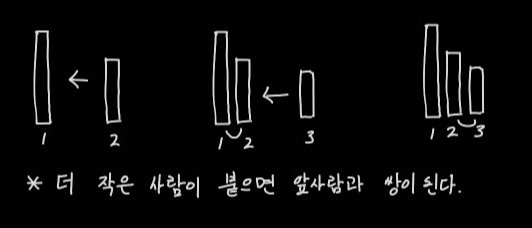키가 더 작은 사람이 온다면 이 사람은 앞 사람하고만 쌍을 이룰 수 있다. 예를 들어 현재 대열이 [5, 4, 3, 2] 라고 해보자. 새로 붙을 사람의 키가 1이라면 이 사람은 그 앞의 4번째 사람과 쌍을 이룰 수 있고 [5, 4, 3, 2, 1] 처럼 대열에 붙으면 된다.