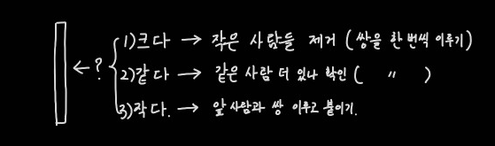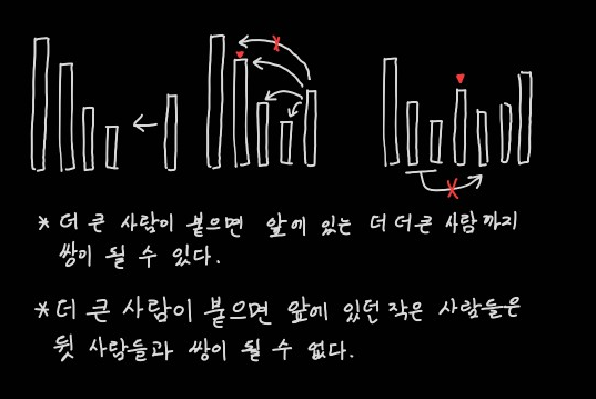 정리해보면 이렇다. 키가 만약 같다면, 그 앞에 키가 같은 사람이 더 있을 가능성이 있다. 이 사람들은 제거되지 않았으면서도 모두 쌍을 이룰 수 있는 사람들이기 때문에 이 사람들과 모두 쌍을 이루고, 그 앞에 있을 수도 있고 없을 수도 있는 더 큰 사람과 마지막으로 쌍을 이룰 수 있다.