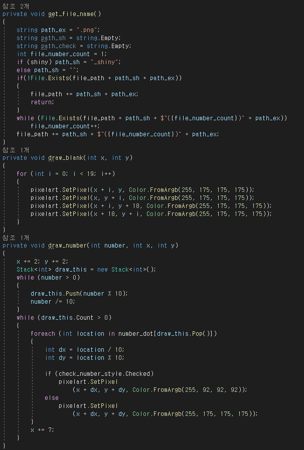 마지막으로 C# 개발 계속 해나가려면 문법도 좀 더 자세히 익혀놔야 할 것 같다. 클래스 구현 없이 이 많은 코드를 하나에 때려 넣으려고 하니 가독성도 너무 떨어지고 객체지향언어라는 장점이 완전히 가려져버린다. 이럴 거면 그냥 C언어 배우는 게 나을지도 모르겠다.(배울 생각 없음)